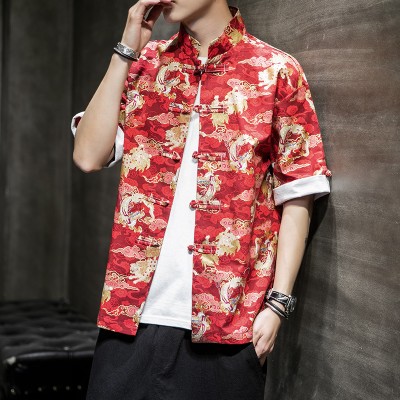 Summer New Chinese Style Floral Men's Casual Short Sleeve Shirt Large Linen Fashion Panbuckle Tang Suit Men