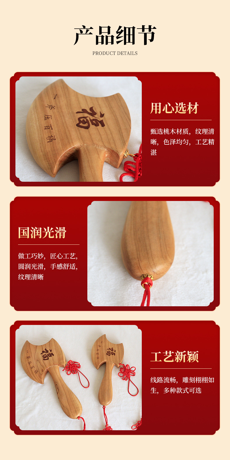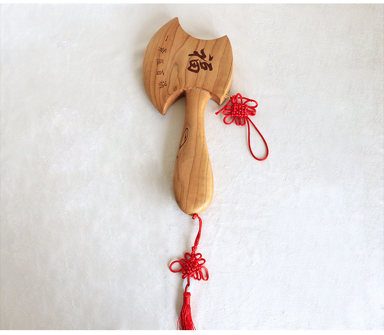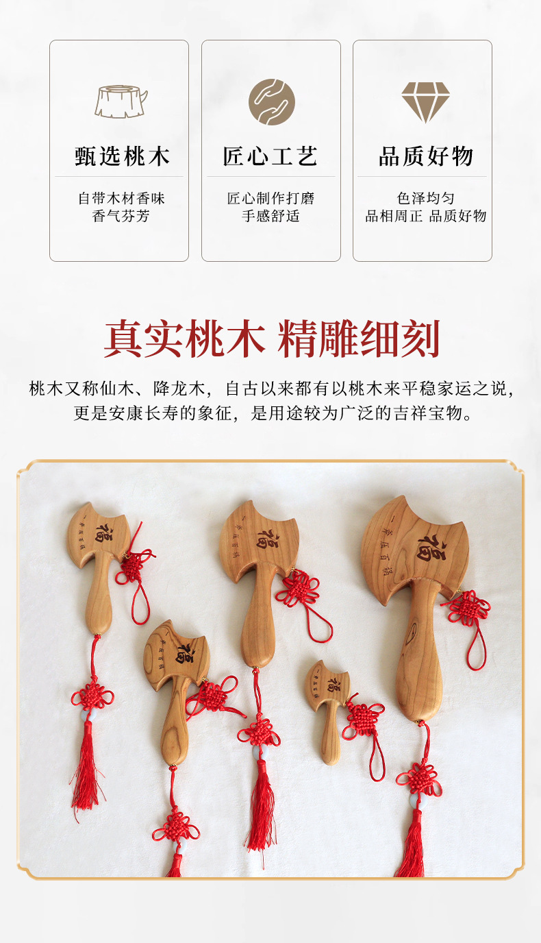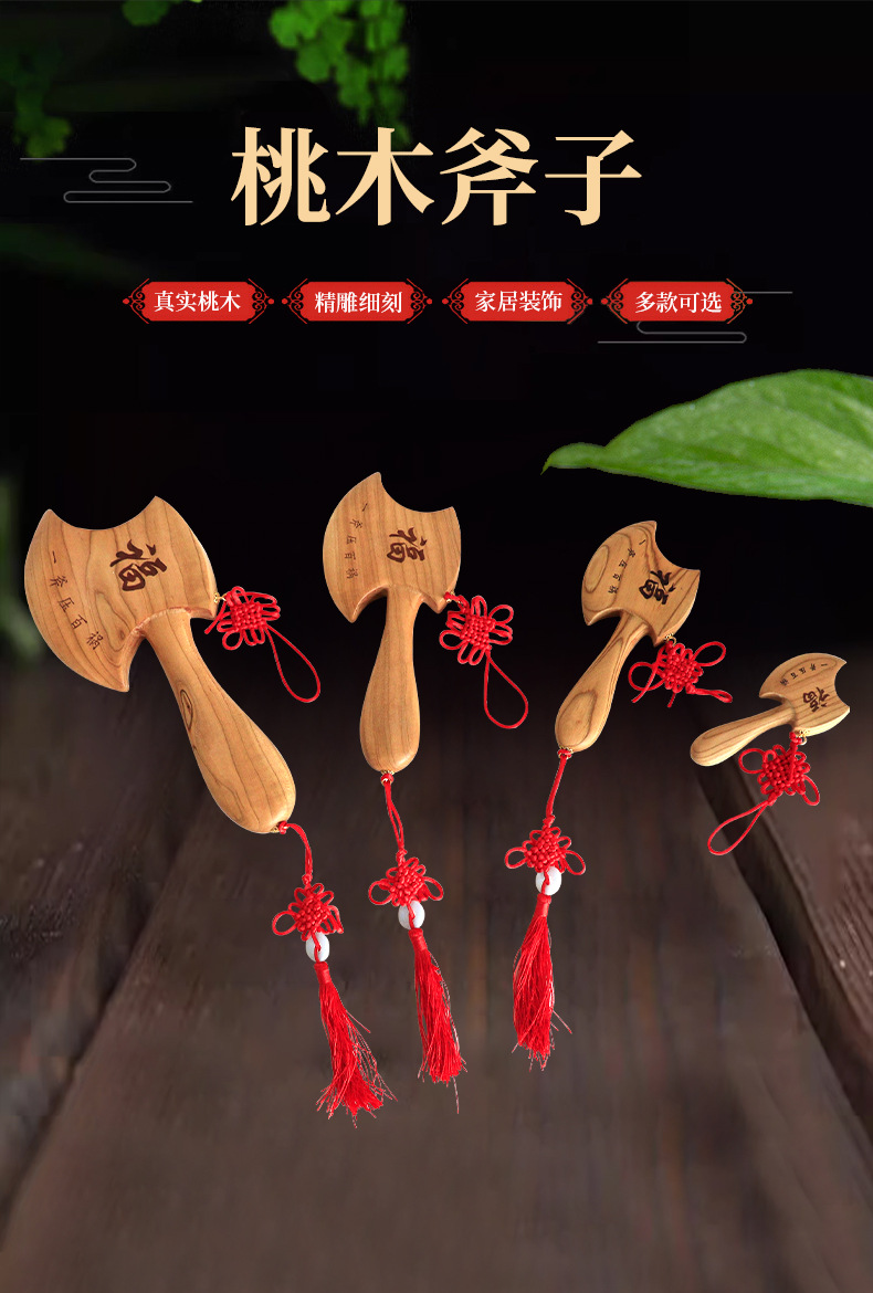Axe, the shape of house; Peach wood is a tool to ward off evil spirits. Peach wood axe pendant, a combination of two effects, can help your house prosper and prevent all evils from invading.