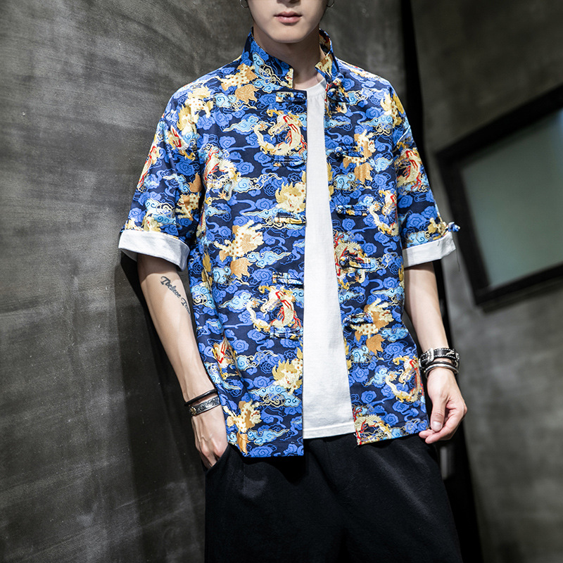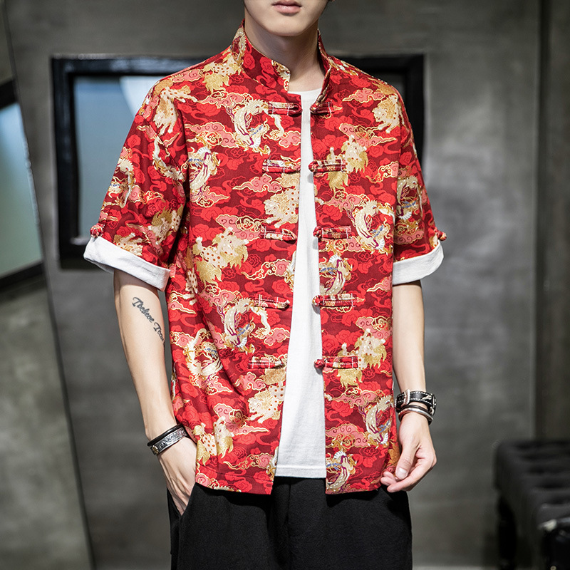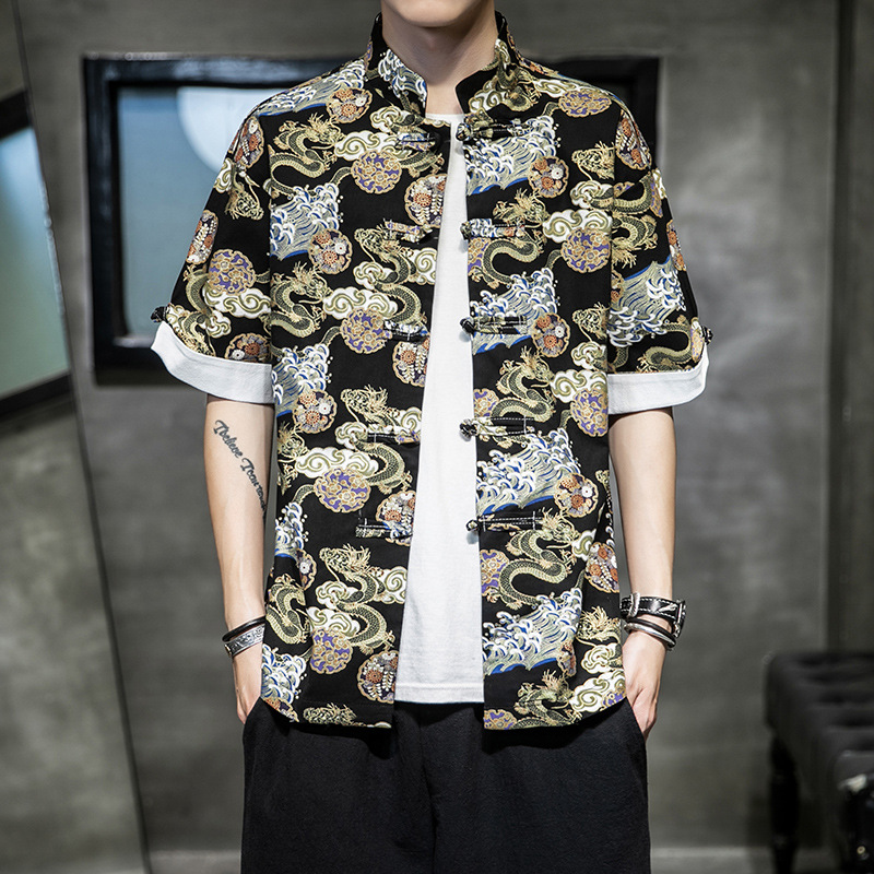Summer New Chinese Style Floral Men's Casual Short Sleeve Shirt Large Linen Fashion Panbuckle Tang Suit Men
