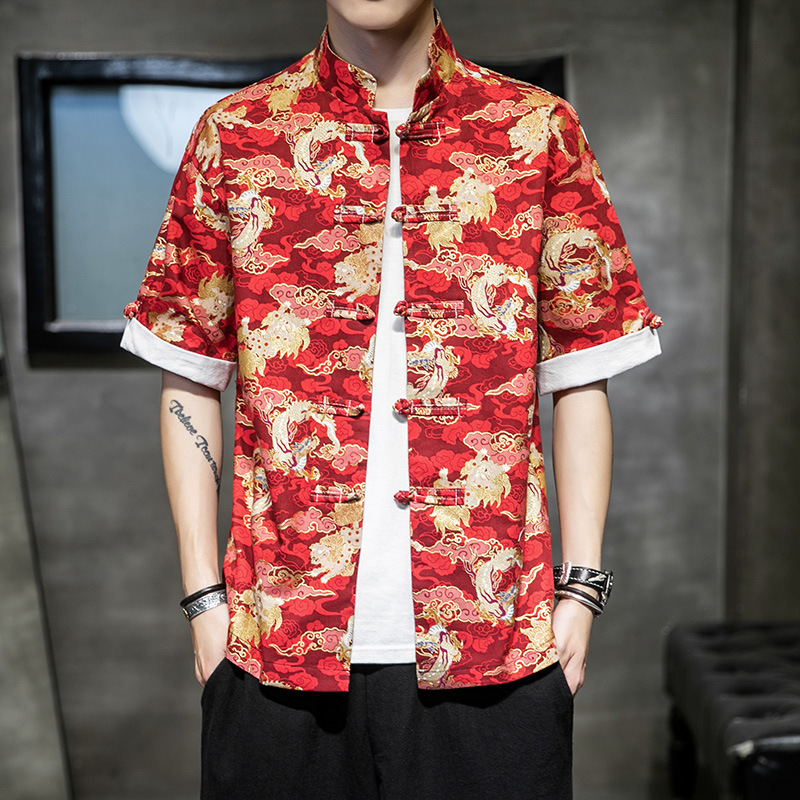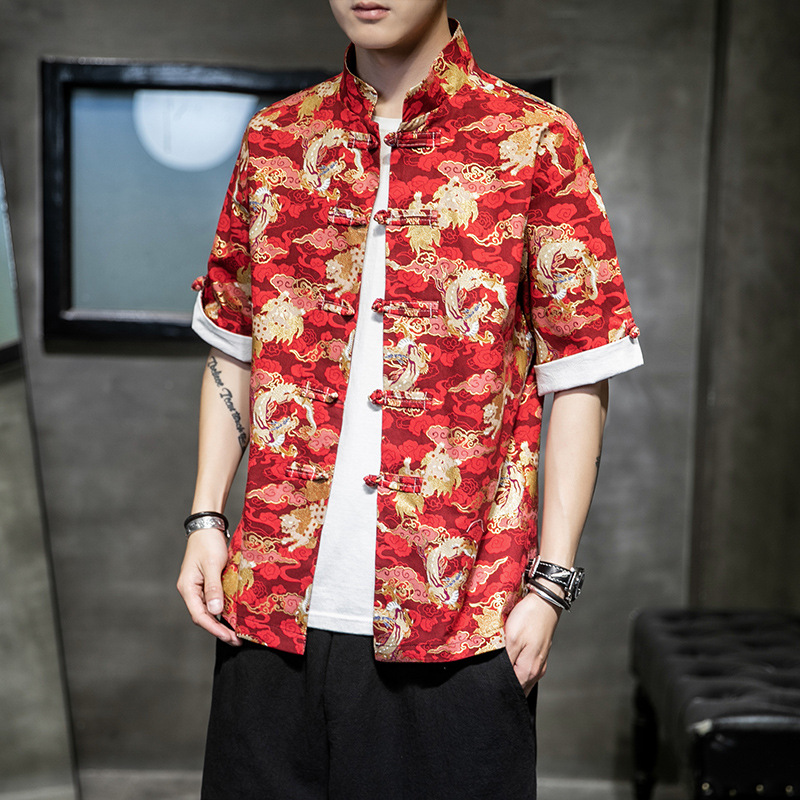 Summer New Chinese Style Floral Men's Casual Short Sleeve Shirt Large Linen Fashion Panbuckle Tang Suit Men